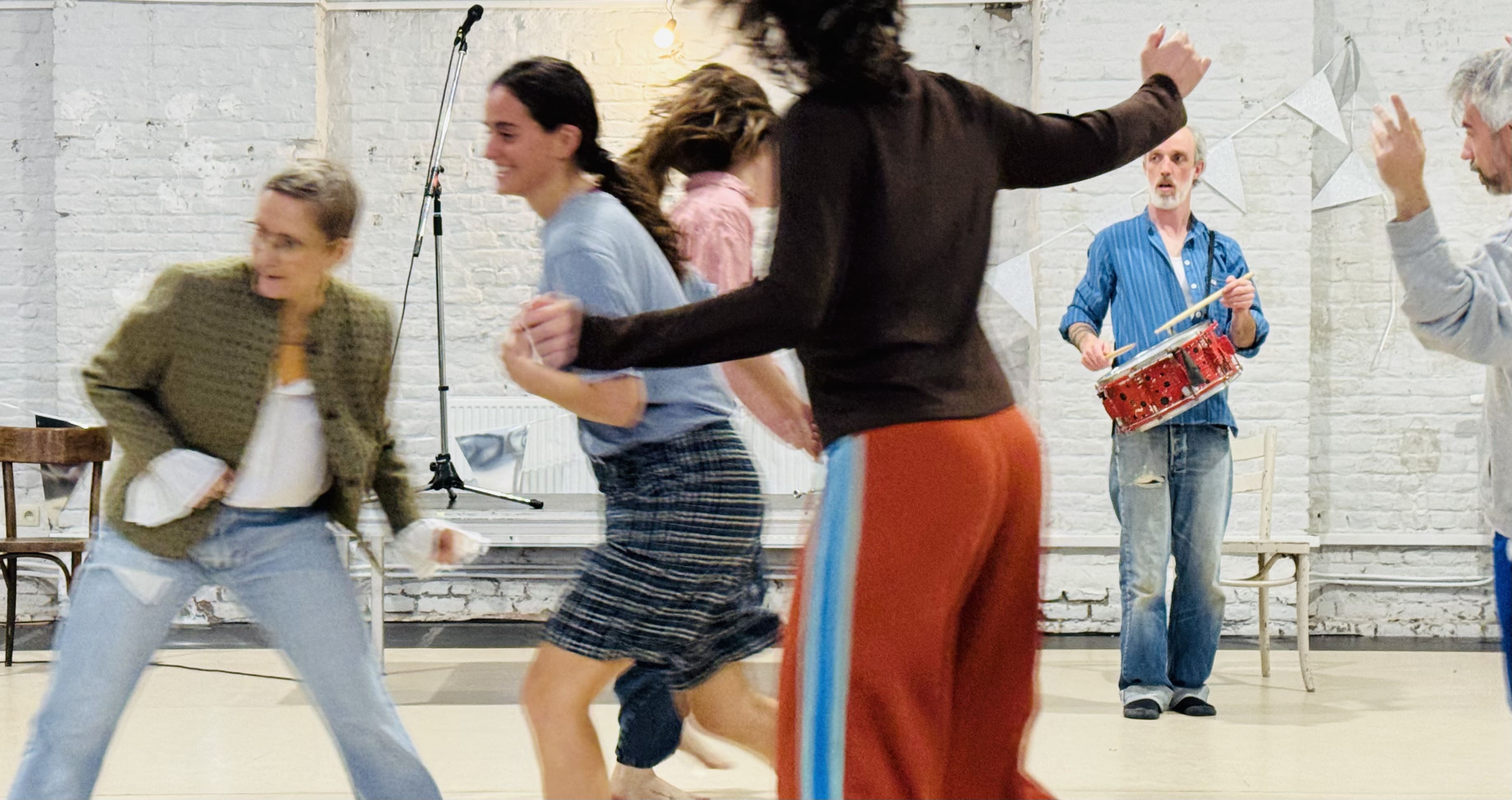 Dans une ambiance de fanfare, la danse et les cuivres déclenchent la joie, l’énergie et le partage. Les 7 interprètes se rassemblent pour préparer une parade et invitent le public à vivre ensemble cette dernière répétition. Ils et elles se mettent en mouvement, s’accordent, s’observent, s’entraident. Les gestes sont simples, parfois fragiles, toujours sincères. Ici, le mouvement ne se fait jamais seul : il se construit avec et vers l’autre, dans l’écoute et l’ajustement.